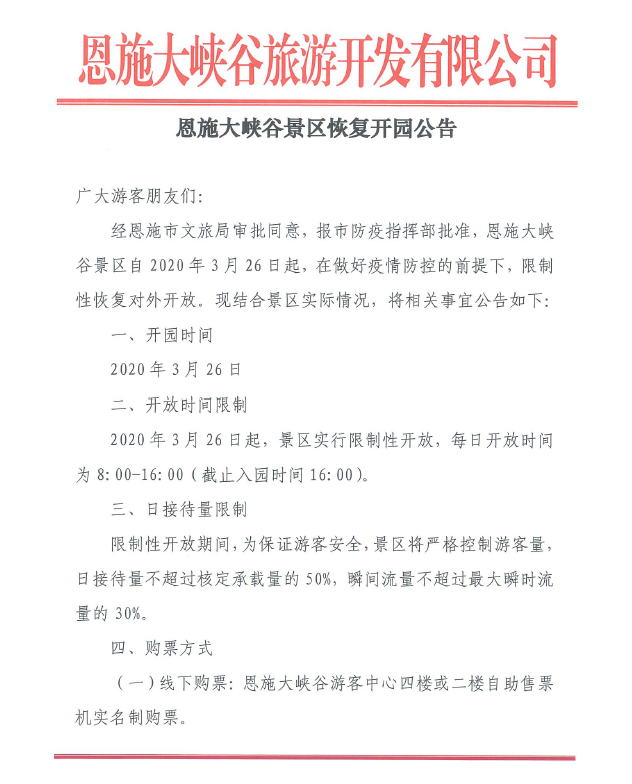 恩施大峽谷旅游開(kāi)發(fā)有限公司今天發(fā)布《恩施大峽谷景區(qū)恢復(fù)開(kāi)園公告》(以下簡(jiǎn)稱(chēng)《公告》),2020年3月26日起,恩施大峽谷景區(qū)恢復(fù)開(kāi)園。值得注意的是,恩施大峽谷將實(shí)行限制性開(kāi)放,每日開(kāi)放時(shí)間為8:00-16:00(截止入園時(shí)間16:00)。