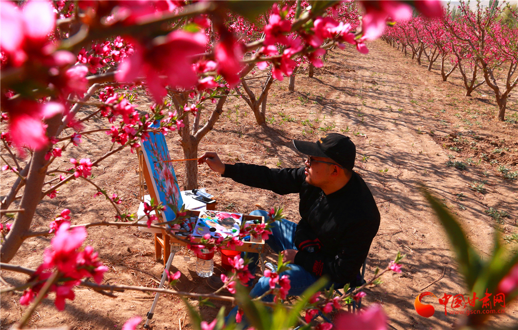 2020年4月22日,一名市民在甘肅省敦煌市七里鎮(zhèn)杜家墩村的桃園中寫生。