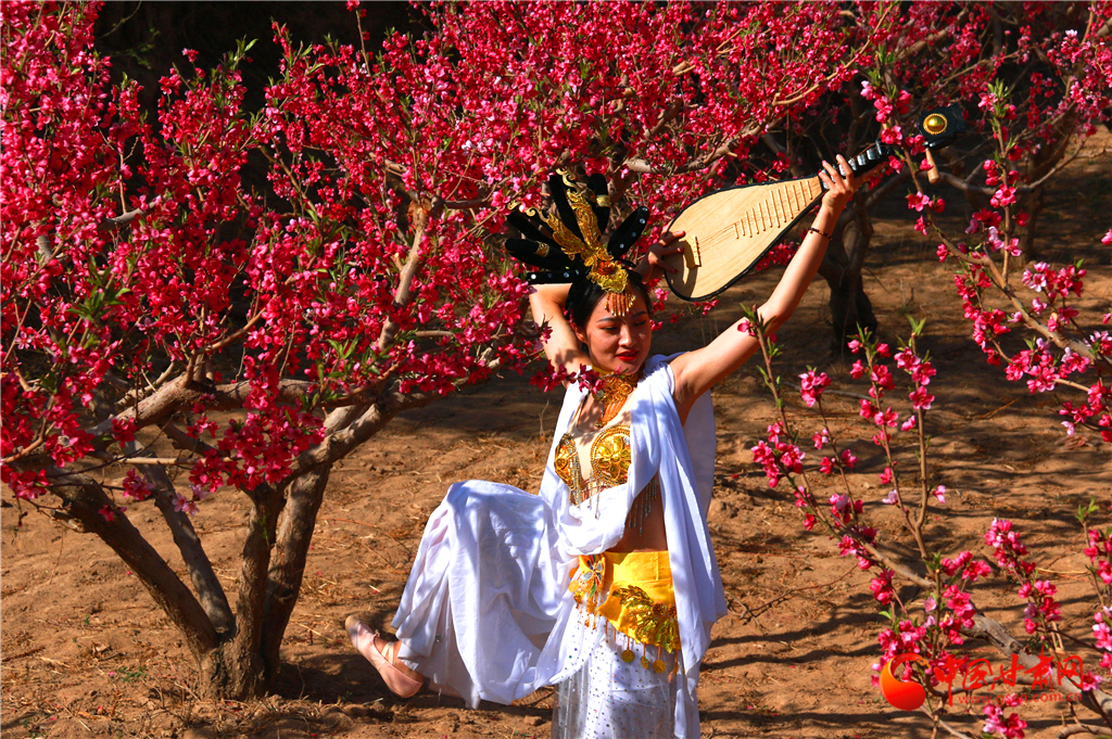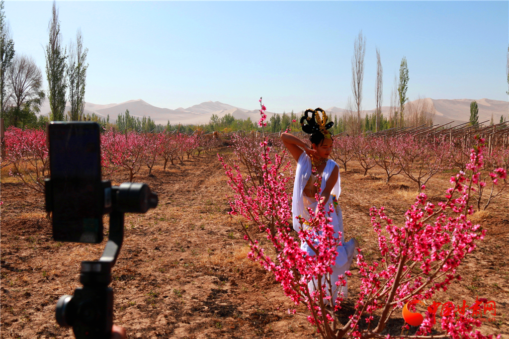 2020年4月22日,敦煌“飛天”在甘肅省敦煌市七里鎮(zhèn)杜家墩村的桃園中拍照。