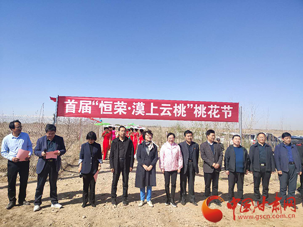 中國(guó)甘肅網(wǎng)4月25日訊(本網(wǎng)記者 張振國(guó) 文/圖)人間四月芳菲盡,大漠桃花始盛開(kāi)。4月25日,騰格里沙漠邊緣、涼州大漠桃花即將開(kāi)放之際,由甘肅恒榮綠洲治沙科技有限公司舉辦的首屆“恒榮·漠上云桃”桃花節(jié)在涼州區(qū)紅水河西該公司生態(tài)經(jīng)濟(jì)林產(chǎn)業(yè)化經(jīng)營(yíng)試驗(yàn)基地“恒榮桃園”開(kāi)幕。