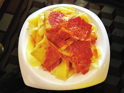 炕鍋洋芋是臨夏農(nóng)家樂(lè)里面常見(jiàn)的一道特色小吃,在臨夏,煎、烙之類的烹飪方式都被稱作炕,炕鍋洋芋因此得名。洋芋切片后,直接放熱油中兩面煎透??诲佈笥蟮淖龇m不復(fù)雜,但其對(duì)于火候的要求卻極其嚴(yán)苛,多一分會(huì)焦,少一分則不熟。