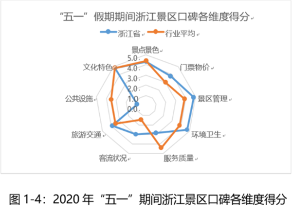 浙江景區(qū)在景區(qū)管理(口碑得分 4.8 分)、門票物價(jià)(口碑得分3.8分)、環(huán)境衛(wèi)生(口碑得分4.7分)表現(xiàn)較好,領(lǐng)先行業(yè)平均水平,但在交通、服務(wù)方面低于行業(yè)平均水平。