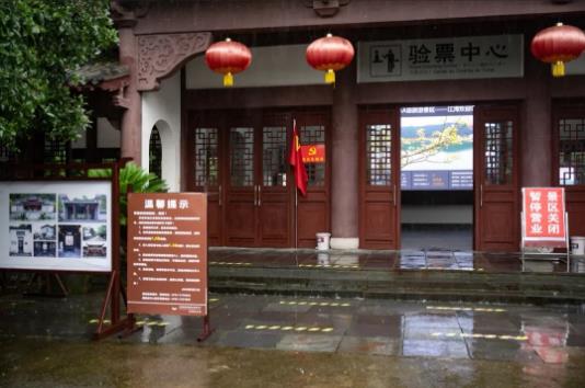 受持續(xù)強(qiáng)降雨影響,婺源江灣景區(qū)入口豎立起了“景區(qū)關(guān)閉、暫停營業(yè)”的提示牌