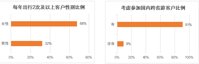 中青旅遨游網近五年訂單數據顯示,每年出行次數2次及以上的客戶中,女性客戶的關注度更高,男女比例32 : 68。針對“國內跨省游解禁后,是否有出行計劃”這一問題,我們以短信形式對上述客戶進行調研,結果顯示有九成以上客戶對此報以期待,出行意愿較為強烈。