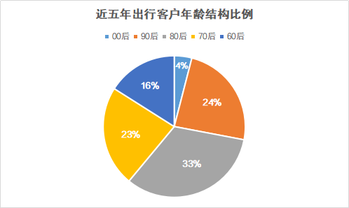 從年齡結構來看,中青旅遨游網近五年訂單數據顯示,80和90后年輕家長已成為出行主力軍,80后占比33%,90后占比24%;70后占比23%,60后占比16%。