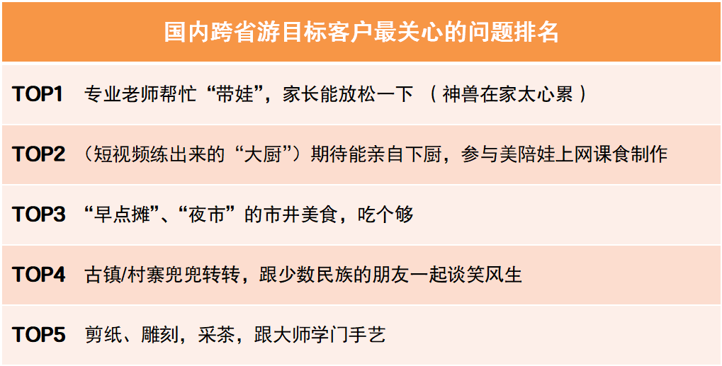 通過針對中青旅遨游網會員、中青旅聯盟成員單位的忠實客戶等群體的調研,以及近半年中青旅遨游網搜索、瀏覽的監(jiān)測數據進行綜合分析。結果顯示,西南和西北是客戶喜好程度最高的兩大地域;云南、江蘇、新疆、三亞、陜西是客戶喜好程度最高的五大熱門目的地。客戶最關心的問題,帶娃、參與、美食、閑逛、學藝則位列前五名。