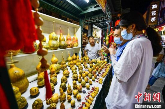 圖為游客購(gòu)買刻葫蘆工藝品?!⊥醣筱y 攝