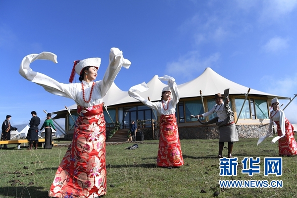 幾名藏族演員在甘南藏族自治州夏河縣阿木去乎鎮(zhèn)安果村阿米貢洪帳篷酒店的草原上表演舞蹈(5月25日攝)。新華社記者 陳斌 攝