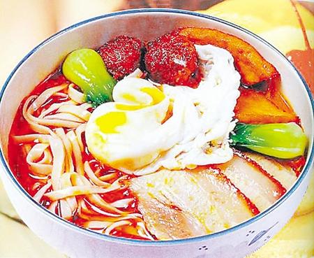 其實(shí),桃花面指的不是面條,而是面條的配料,亦如我們的“牛肉面”“臊子面”中的“牛肉”和“臊子”。不同于“牛肉”和“臊子”的是,桃花面中的“桃花”亦不是枝頭的那片美艷,而是擺在碗中面條上的一片誘人口水的燒肉、一個金黃的丸子、一個白白嫩嫩的荷包蛋外加幾根青翠怡人的菠菜。在碗口這個不大的天地間,綠的是新芽,黃的如花蕊,相間在紅肉白蛋里,自然有了桃花的寫意,故名“桃花面”。