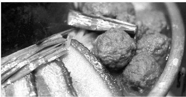 等熬得滋滋有聲香氣四溢時(shí),撒上蔥絲、紅辣椒絲和香菜就可開吃。