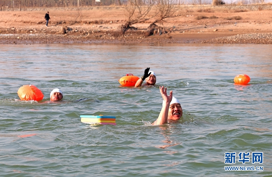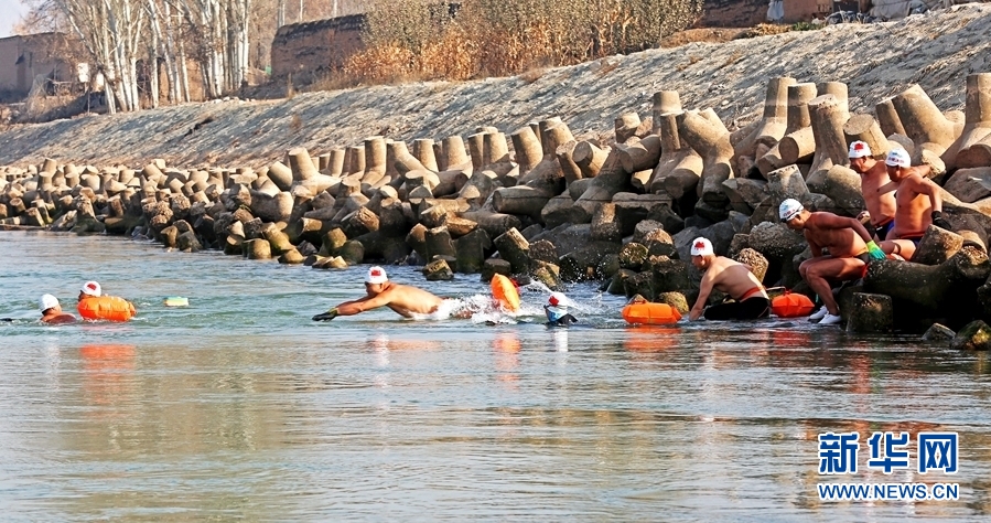 2022年元旦假期,甘肅省白銀市21名冬泳健將冒著嚴(yán)寒來(lái)到黃河白銀水川段,以漂流或橫渡的方式暢游黃河,歡慶新年。新華網(wǎng)發(fā)(熊江彬 攝)