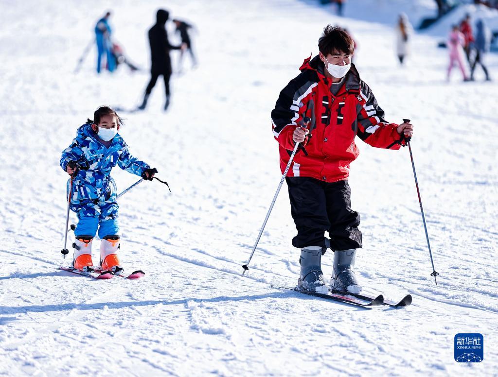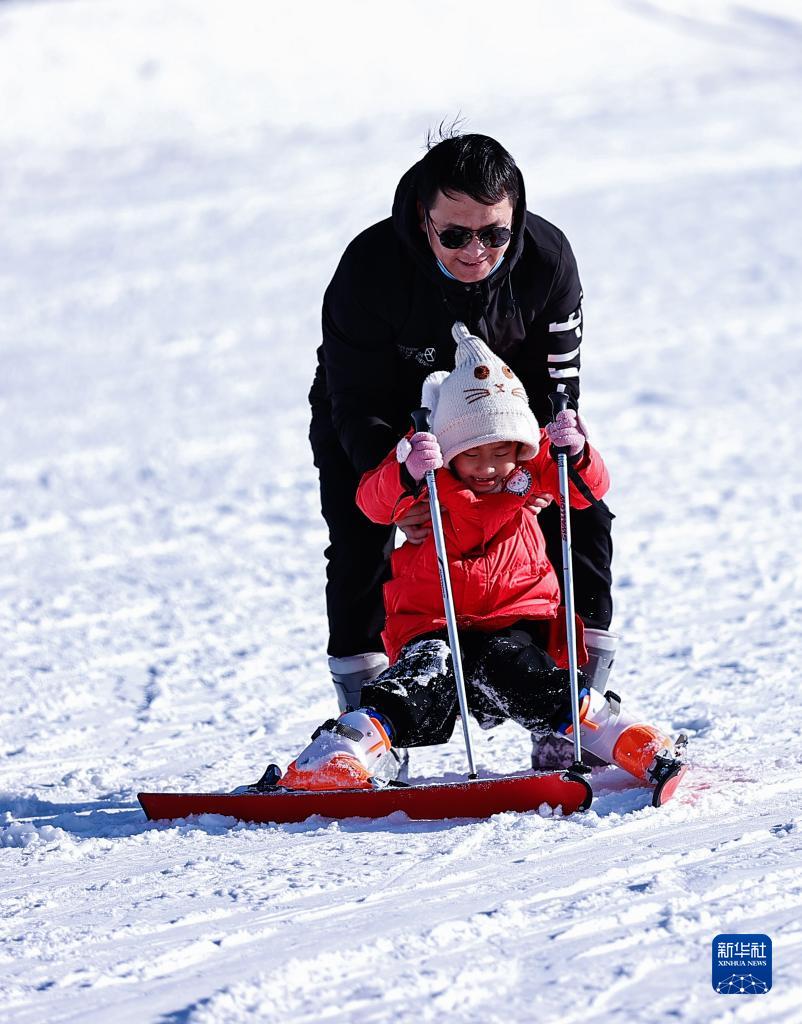 2月19日,在寧夏銀川市閱海滑雪場,一名家長帶著孩子玩耍。