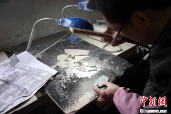 1971年出生的李成者從10多歲開(kāi)始跟隨父親學(xué)習(xí)彩石鑲嵌技藝,在這一行已經(jīng)干了30多年。他說(shuō),彩石鑲嵌技藝在瑞安瀕臨失傳,目前在陶山鎮(zhèn)從事這一行業(yè)的不到10人。從這次制作彩石鑲嵌《清明上河圖》,他也學(xué)到了很多東西。