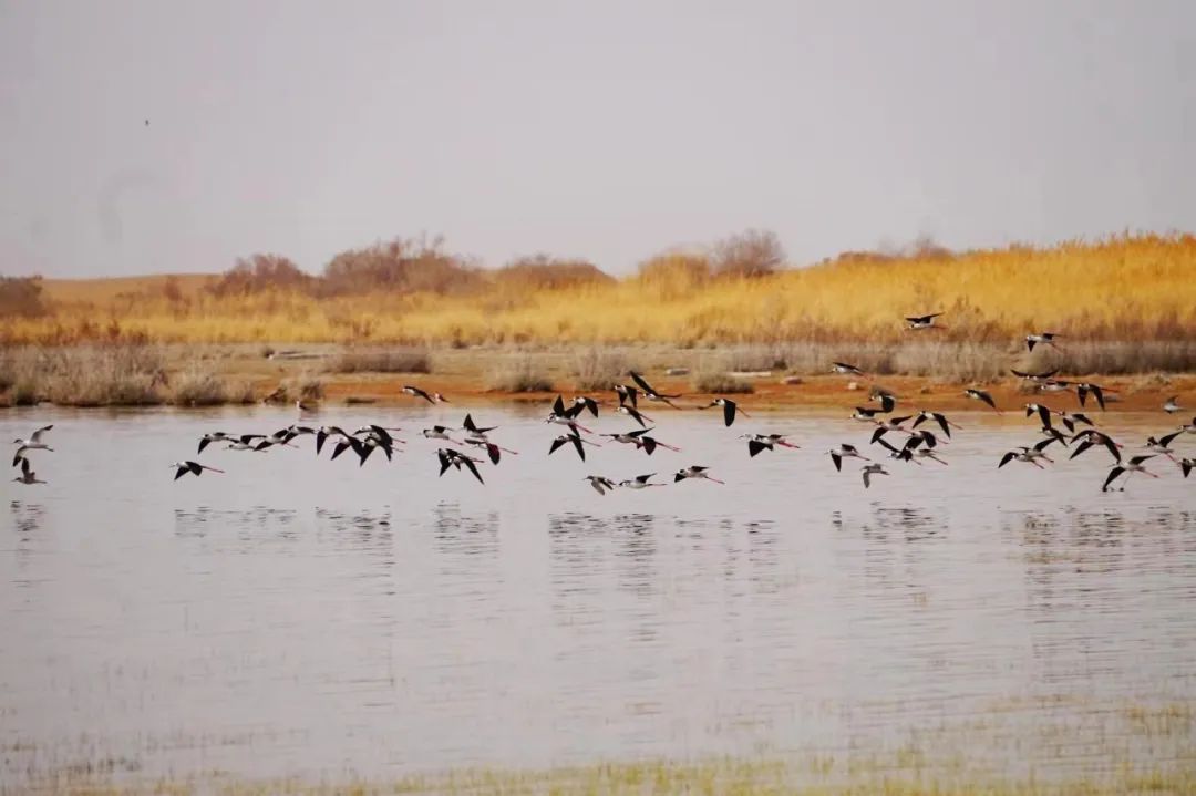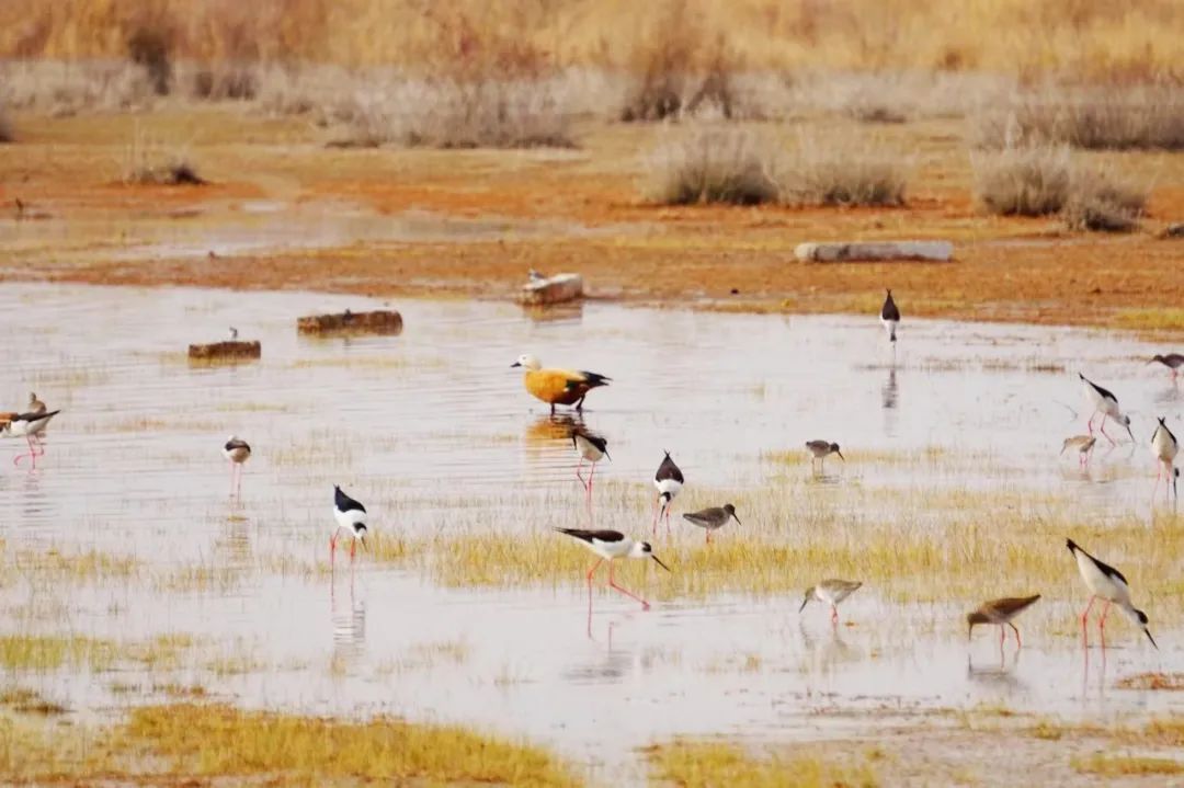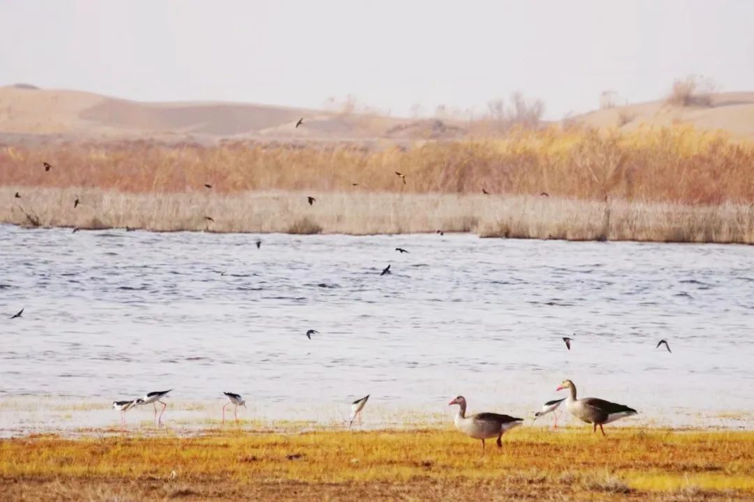 四月的敦煌大地春和景明,在庫姆塔格沙漠的邊緣,位于陽關(guān)濕地的壽昌海子波平如鏡,碧水映襯著祁連山上的雪峰,各種色彩斑斕地鳥兒仿佛收到了春天的邀約,在這里參加一場盛大的聚會(huì)。它們有的在湖面上引頸入水自在覓食,有的踏波翩翩起舞,有的追逐嬉戲鳴唱,有的在岸邊閑庭信步、悠然自得地曬太陽......構(gòu)成了一幅多姿多彩的和諧自然生態(tài)畫卷。