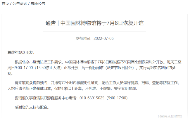 中國園林博物館發(fā)布最新消息,根據北京市疫情防控工作要求,中國園林博物館7月8日起按照75%限流比例恢復對外開放。