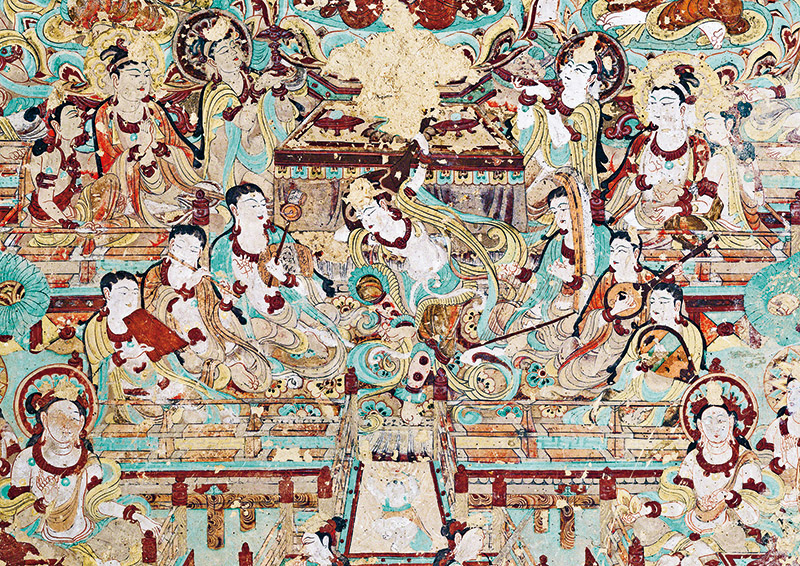 敦煌文化延續(xù)近兩千年,是世界現(xiàn)存規(guī)模最大、延續(xù)時(shí)間最長(zhǎng)、內(nèi)容最豐富、保存最完整的藝術(shù)寶庫(kù),是世界文明長(zhǎng)河中的一顆璀璨明珠,也是研究我國(guó)古代各民族政治、經(jīng)濟(jì)、軍事、文化、藝術(shù)的珍貴史料。圖為莫高窟第112窟南壁壁畫“反彈琵琶樂(lè)舞圖”。 敦煌研究院供圖