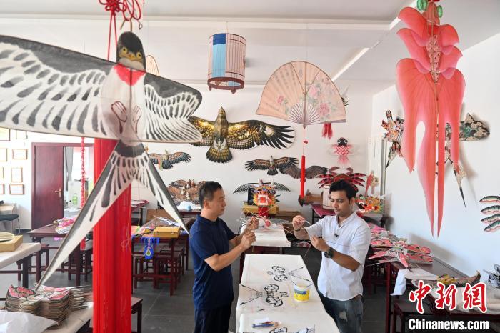 巴基斯坦籍留學(xué)生烏瑪爾(右)跟隨第什里風(fēng)箏第五代傳承人趙艷強(左)學(xué)習(xí)傳統(tǒng)風(fēng)箏制作。 翟羽佳 攝