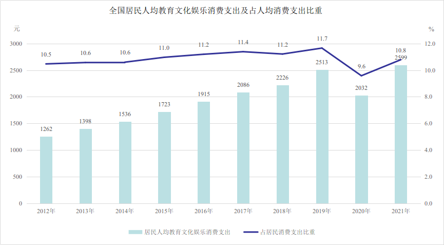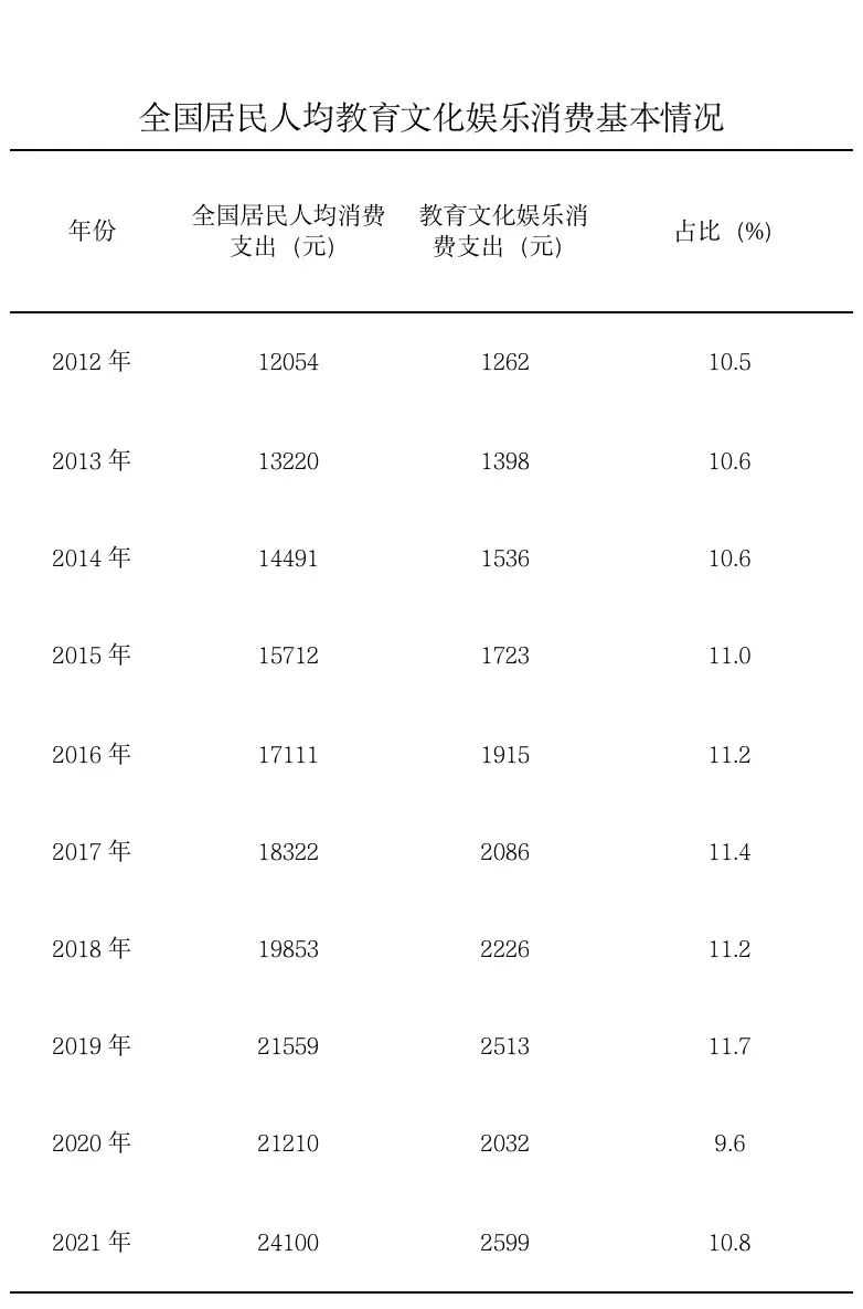 記者從文化和旅游部獲悉,十年來(lái),文化產(chǎn)品和服務(wù)供給不斷豐富,促進(jìn)文化和旅游消費(fèi)取得顯著成效。2021年,全國(guó)居民人均教育文化娛樂(lè)支出2599元,較2012年增長(zhǎng)105.9%。