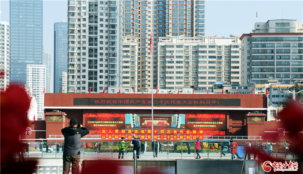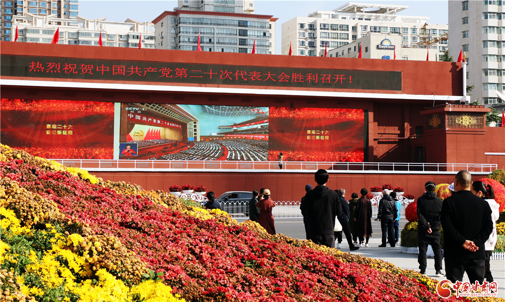 蘭州市東方紅廣場(chǎng),許多市民駐足路邊,通過(guò)大屏幕收看中國(guó)共產(chǎn)黨第二十次全國(guó)代表大會(huì)盛況。