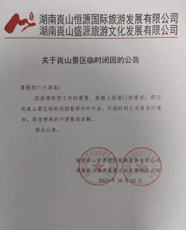 10月25日電 10月24日,崀山旅游區(qū)發(fā)布《關于崀山景區(qū)臨時閉園的公告》稱,因疫情防控工作的需要,根據(jù)上級部門的要求,10月24日起崀山景區(qū)臨時閉園,暫停對外開放,開園時間將另行通知。