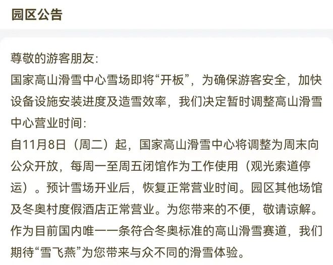根據(jù)公告,自11月8日(周二)起,國家高山滑雪中心將調(diào)整為周末向公眾開放,每周一至周五閉館作為工作使用(觀光索道停運)。預計雪場開業(yè)后,恢復正常營業(yè)時間。目前,“雪飛燕”已對外開放,如果纜車開放,便可以乘坐纜車上到山頂。