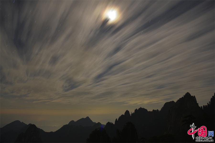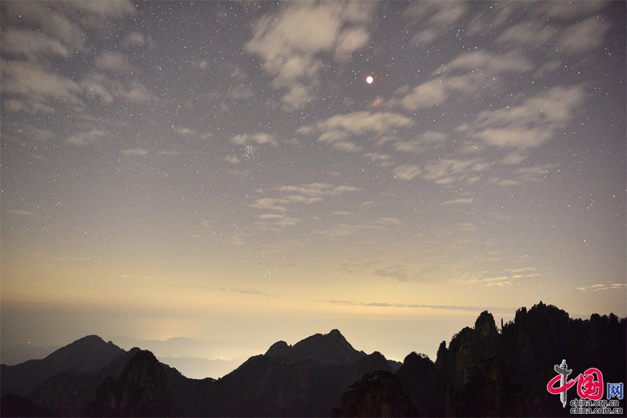 2022年11月8日晚,黃山之巔的群峰上出現(xiàn)的月全食景觀,給美麗的黃山增添一道美輪美奐的風景。