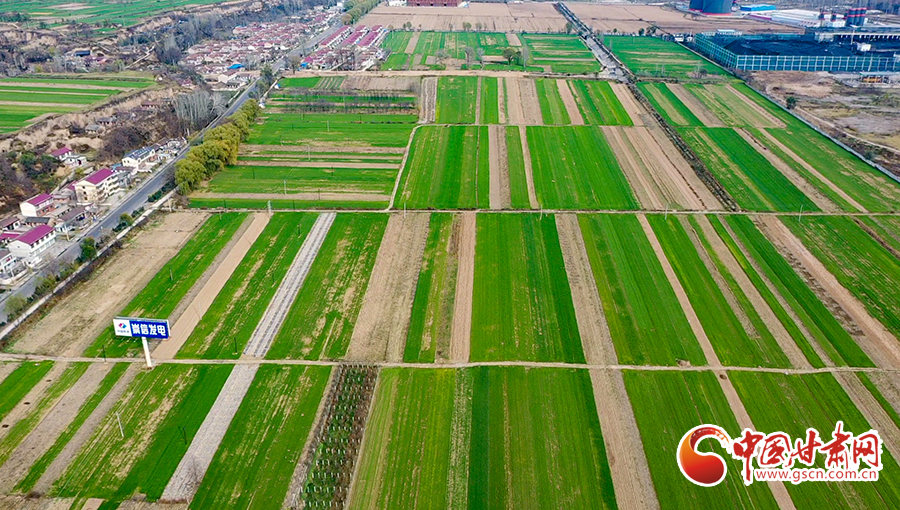 初冬時(shí)節(jié),平?jīng)鍪谐缧趴h錦屏鎮(zhèn)農(nóng)田里冬小麥長(zhǎng)勢(shì)喜人,從空中俯瞰,給田野鋪上了綠色的地毯。