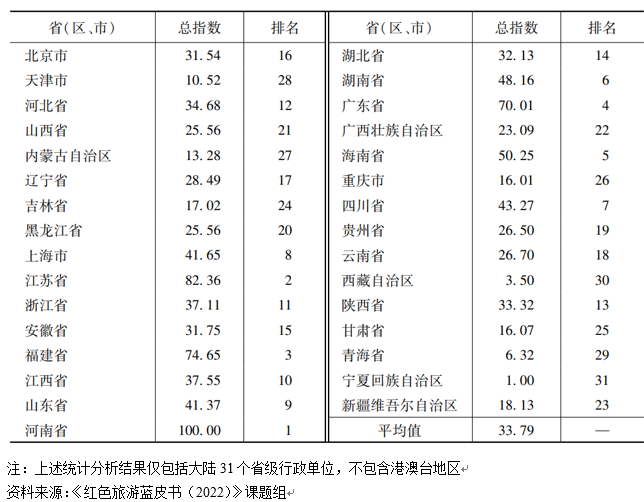 近日,北京第二外國語學(xué)院旅游科學(xué)學(xué)院與社會(huì)科學(xué)文獻(xiàn)出版社共同發(fā)布了紅色旅游藍(lán)皮書《中國紅色旅游發(fā)展報(bào)告(2022)》(以下簡(jiǎn)稱《藍(lán)皮書》)。《藍(lán)皮書》指出,中國紅色旅游發(fā)展水平持續(xù)提升,31個(gè)省級(jí)行政單位(不含港澳臺(tái)地區(qū))的紅色旅游發(fā)展指數(shù)排名中,位列前十的依次為河南省、江蘇省、福建省、廣東省、海南省、湖南省、四川省、上海市、山東省、江西省。
