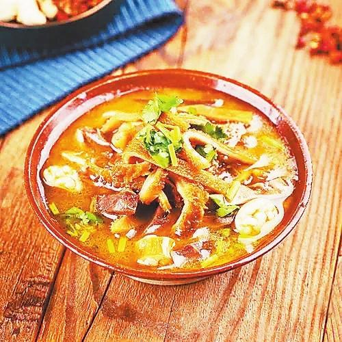 羊雜湯用煮羊肉的湯為原汁,放入切成細片的羊頭肉、羊肚、羊百葉,鮮湯加鹽、蔥白、香菜即可。西北的大蔥多用莖斜削,放于碗底,開水燙后香味溢出。西北人喝湯習慣加油潑辣子,紅紅的一大片,微辣不燥。