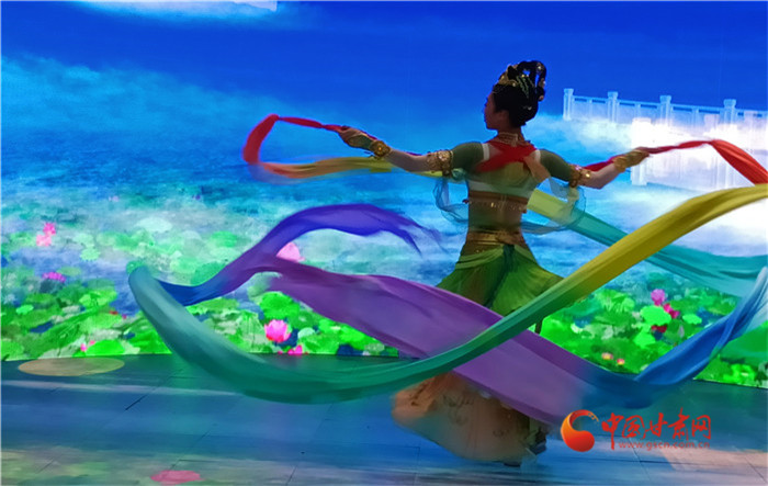 如意甘肅館選擇“以鹿王本生圖”中的綠色作為設(shè)計(jì)的主色調(diào),將敦煌元素鑲嵌在展館各個(gè)角落。特別是門口的展演舞臺,經(jīng)典舞劇《絲路花雨》展演的反彈琵琶、敦煌伎樂天等將觀眾帶入了有聲有色的敦煌,成為如意甘肅館的一大吸睛之處。