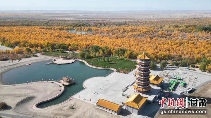圖為金塔沙漠胡楊林景區(qū)內,金色的胡楊流光溢彩,遠看如同一片金色的海洋。(無人機照片) 九美旦增 攝