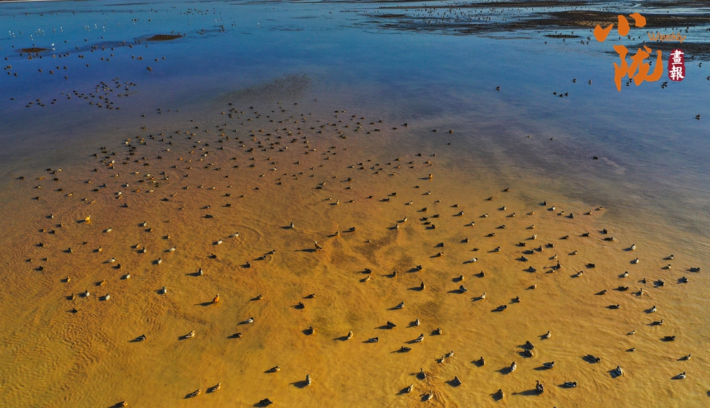 秋風(fēng)輕柔,成群結(jié)隊的候鳥在水面上自游穿梭、追逐嬉戲,與藍天、湖水、蘆葦、胡楊、沙漠構(gòu)成了一幅美麗和諧的生態(tài)畫卷,盡顯一片生機勃勃。