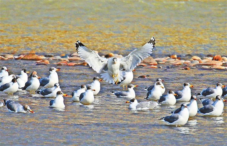 冬日的蘭州市黃河岸邊候鳥(niǎo)翔集,嬉戲的候鳥(niǎo)和流動(dòng)的河水交織成一幅美麗自然的和諧畫卷。 新甘肅·甘肅日?qǐng)?bào)記者 丁凱 田蹊