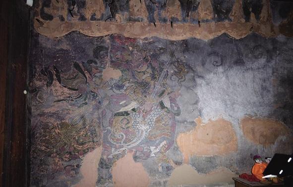 現(xiàn)建筑保存完好,塑像多被破壞,僅存明代懸塑七尊,塑像腳底踩踏祥云,衣帶飄逸靈動,面容栩栩如生。東西兩壁留有四位天神畫像。殿內(nèi)遺留的龐、劉、茍、畢四大雷部元帥門壁畫,與門楣上方的懸塑和拱眼壁上繪畫的尊神,均是研究明代道教藝術(shù)的珍貴遺存,是當?shù)厝濉⒌?、佛三教并存,多元文化共同發(fā)展的歷史見證,對研究土司文化具有重要價值。
