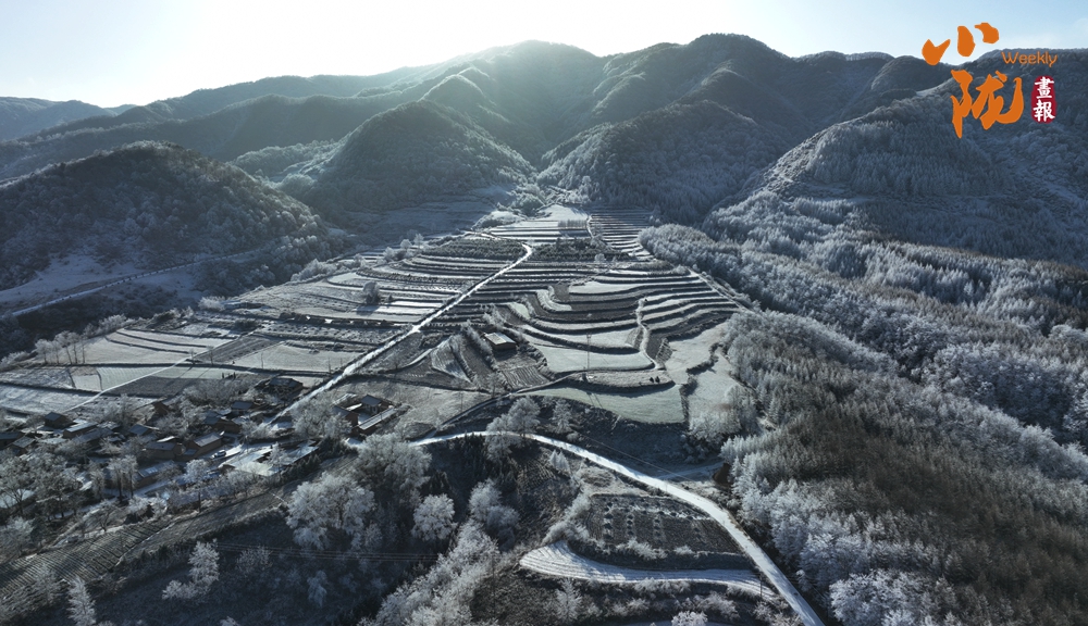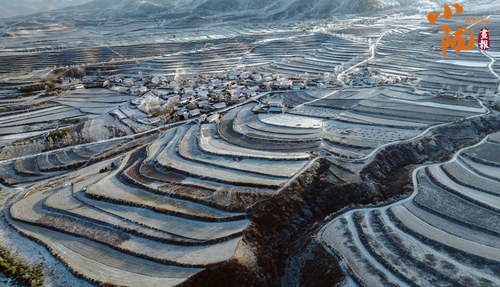 雪落千層入畫來。雪后初晴,被冬雪覆蓋的梯田,銀裝素裹,如大自然的素描,錯落有致的線條,慢慢鋪展出一幅山村美景。