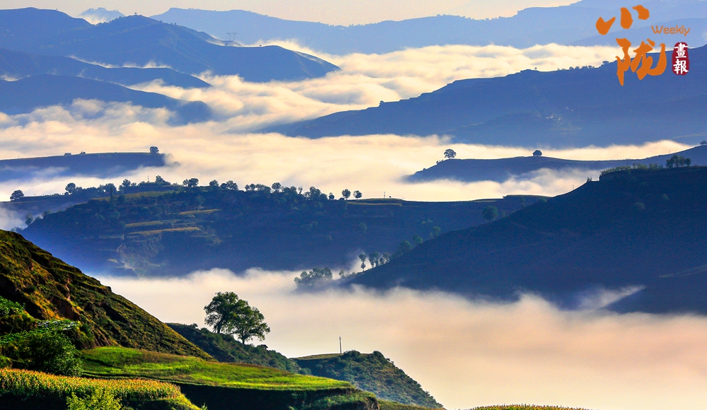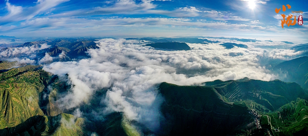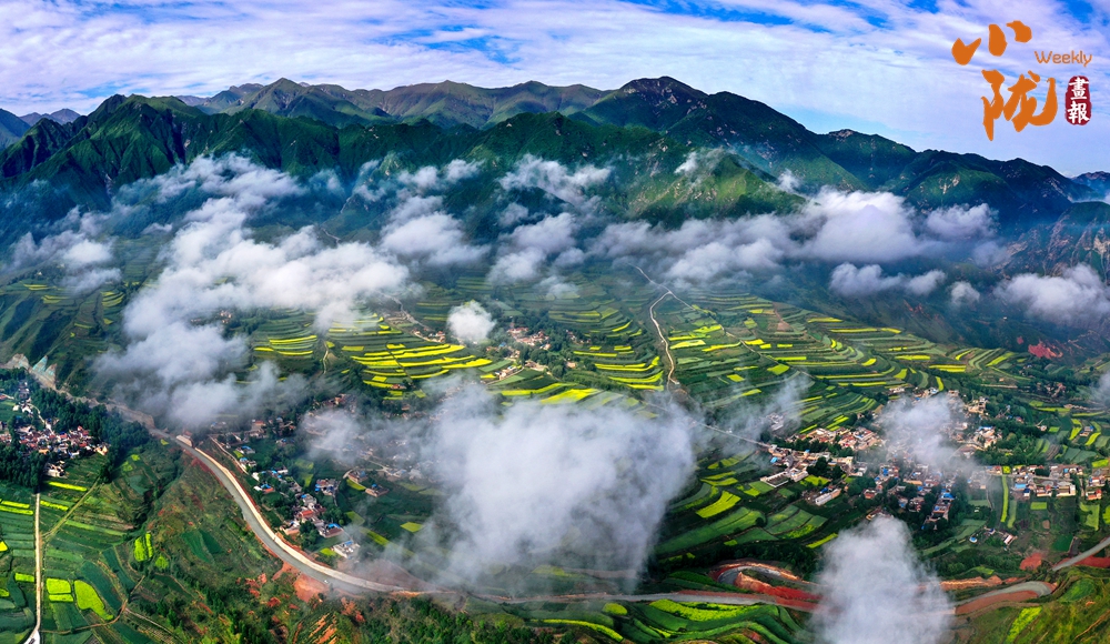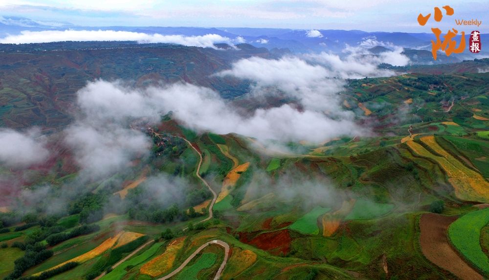 在旅游大通道積石山段遠眺,云霧穿山飄過,遠處的村莊和梯田時隱時現(xiàn),遠山近嶺,草樹煙村......置身其中,仿佛步入了人間仙境。