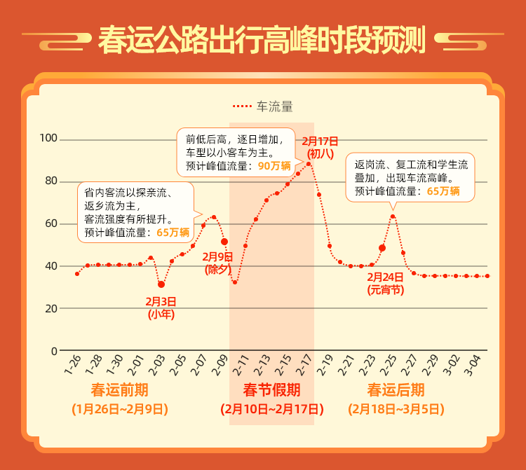 春運(yùn)前期(1月26日至2月9日):省內(nèi)客流以隴南、天水、嘉峪關(guān)、武威、平?jīng)龅确较虻奶接H流、返鄉(xiāng)流為主,客流強(qiáng)度有所提升,跨省客流以出疆途經(jīng)甘肅返回內(nèi)地的返鄉(xiāng)流為主,出現(xiàn)節(jié)前自西向東的潮汐現(xiàn)象。預(yù)計2月8日(臘月二十九)國省道路交通流量較大,公眾出行迎來集中高峰。此外,受群眾采辦年貨、休閑逛街、中短途探親訪友以及大型活動等多種因素影響,各市城區(qū)貨物市場、繁華商圈等周邊區(qū)域以及部分主干道路,將出現(xiàn)一定的交通壓力。