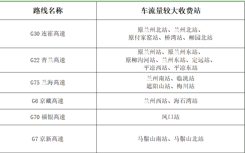 (一)高速公路重點(diǎn)路段。以蘭州為中心的放射線及其聯(lián)絡(luò)線為重點(diǎn)。如:G30連霍高速,G22青蘭高速,G6京藏高速,G70福銀高速,G75蘭海高速,S1機(jī)場高速等路段及相關(guān)收費(fèi)站、服務(wù)區(qū)。