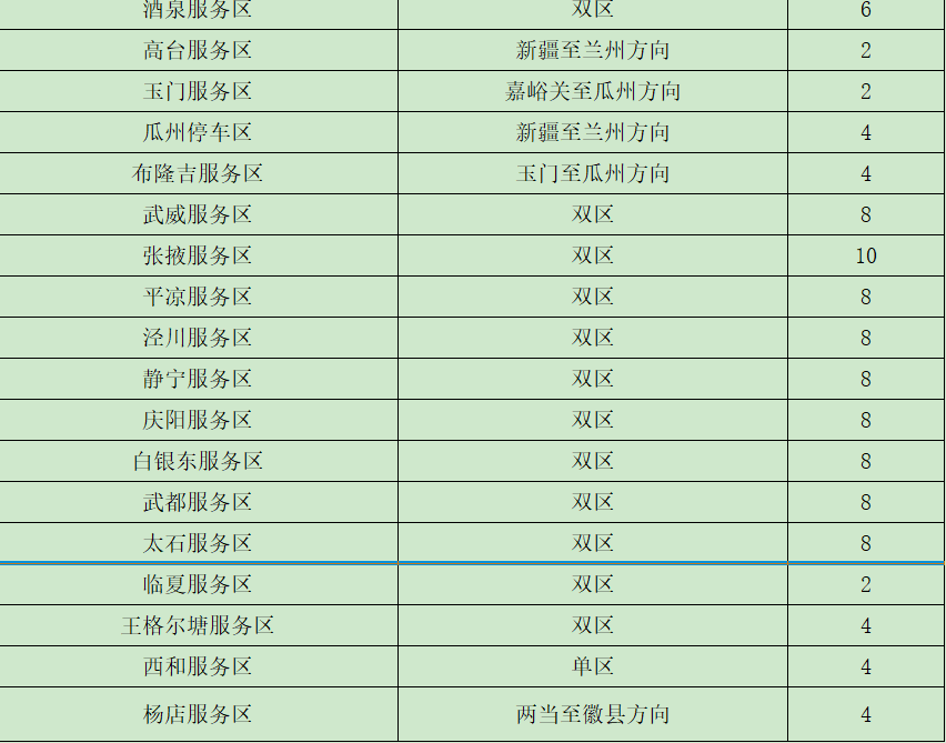 ?。ǘ┲攸c(diǎn)客運(yùn)車站班線。省內(nèi)二級及以上客運(yùn)站正常營運(yùn),以省會城市、人口密集市縣的站點(diǎn)及之間的班線為重點(diǎn)。如:蘭州客運(yùn)東站、南站,天水汽車站等站點(diǎn)以及蘭州—定西、蘭州—西峰、臨洮—平川、舟曲—武都、金昌—武威等客運(yùn)班線。 (三)車流量較大服務(wù)區(qū)。預(yù)計我省車流量較大服務(wù)區(qū)為定西服務(wù)區(qū)、酒泉服務(wù)區(qū)、武威服務(wù)區(qū)、高臺服務(wù)區(qū)、長城驛服務(wù)區(qū)、靜寧服務(wù)區(qū)、會寧服務(wù)區(qū)、太石服務(wù)區(qū)、蘭州北服務(wù)區(qū)、接駕嘴服務(wù)區(qū)、永登服務(wù)區(qū)。