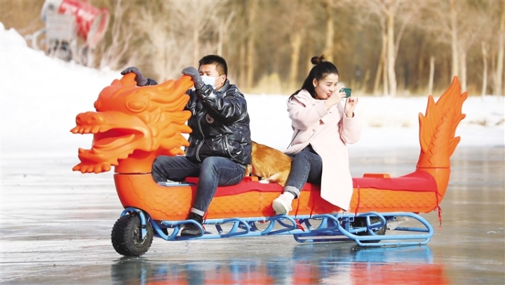 游客在金塔沙漠胡楊林冰雪嘉年華項目娛樂區(qū)游玩。魏 丹 攝
