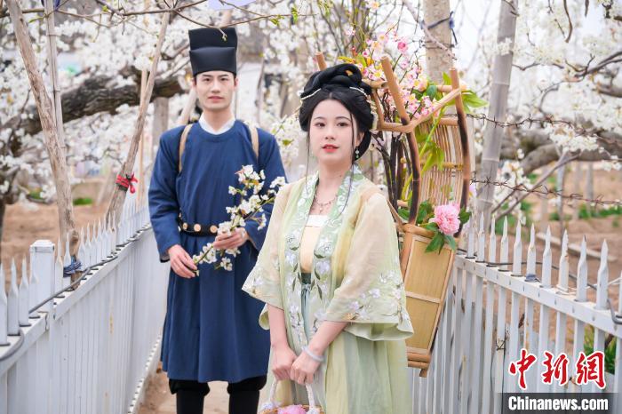原標(biāo)題:山東萊陽萬畝梨花惹人醉 民眾著古裝游園