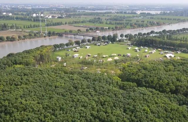 在上海松江區(qū)一處營地,市民游客在河邊草地上搭起帳篷。(2023年9月29日,無人機照片)。新華社記者 方喆攝