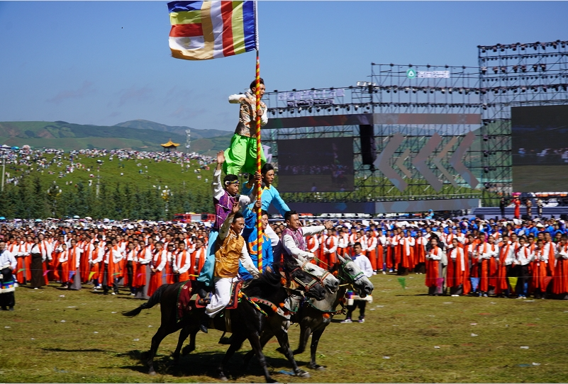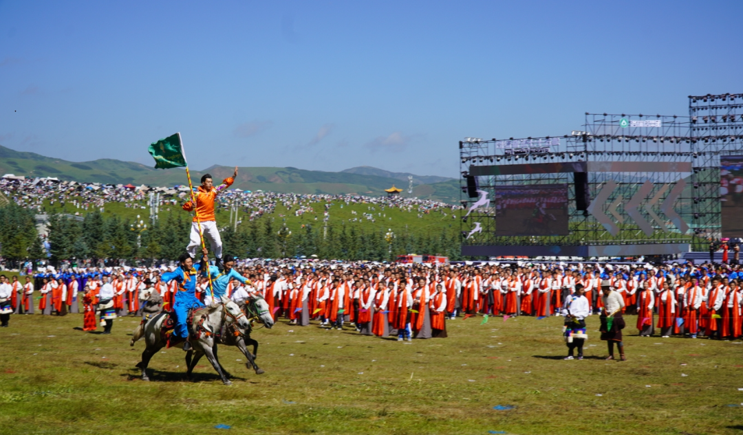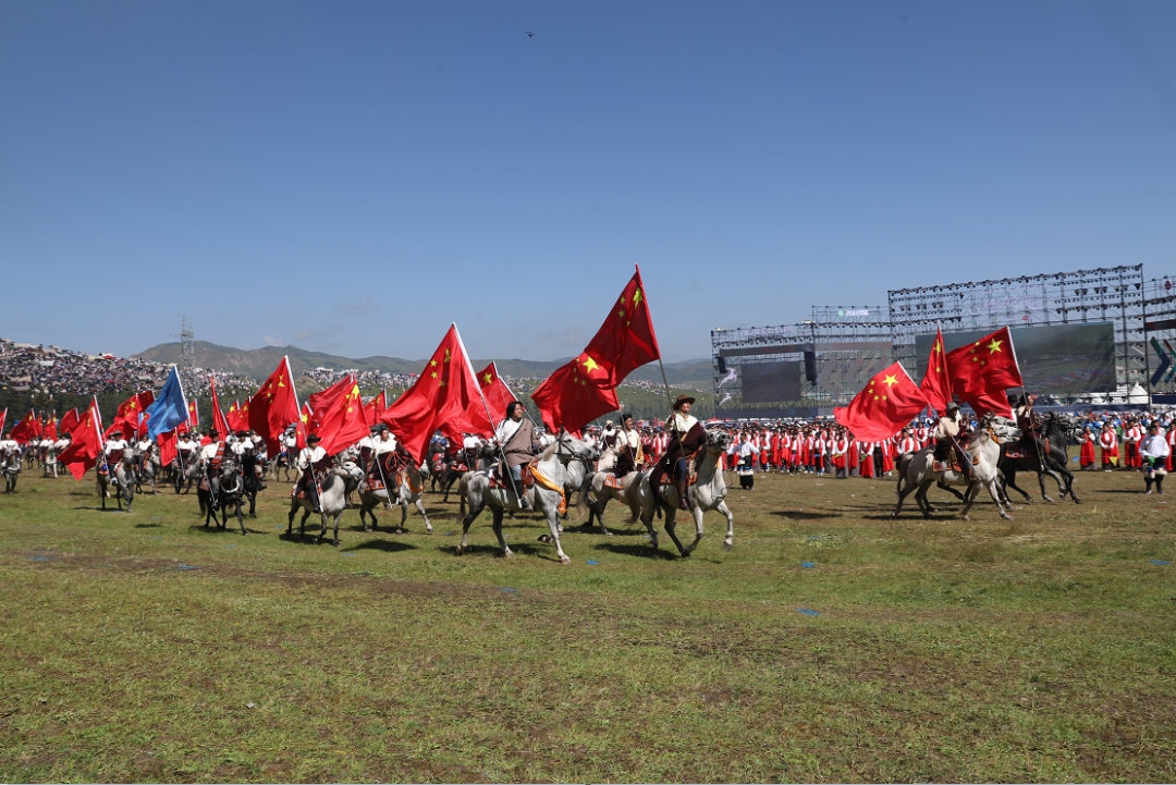 草原騎手乘著矯健的駿馬高舉著鮮艷的五星紅旗從主席臺前奔馳而過,讓在場的數(shù)萬觀眾贊嘆不已,呈現(xiàn)出一個(gè)絢麗多彩的甘南、和諧穩(wěn)定的甘南、朝氣蓬勃的甘南、包容開放的甘南、團(tuán)結(jié)奮進(jìn)的甘南。