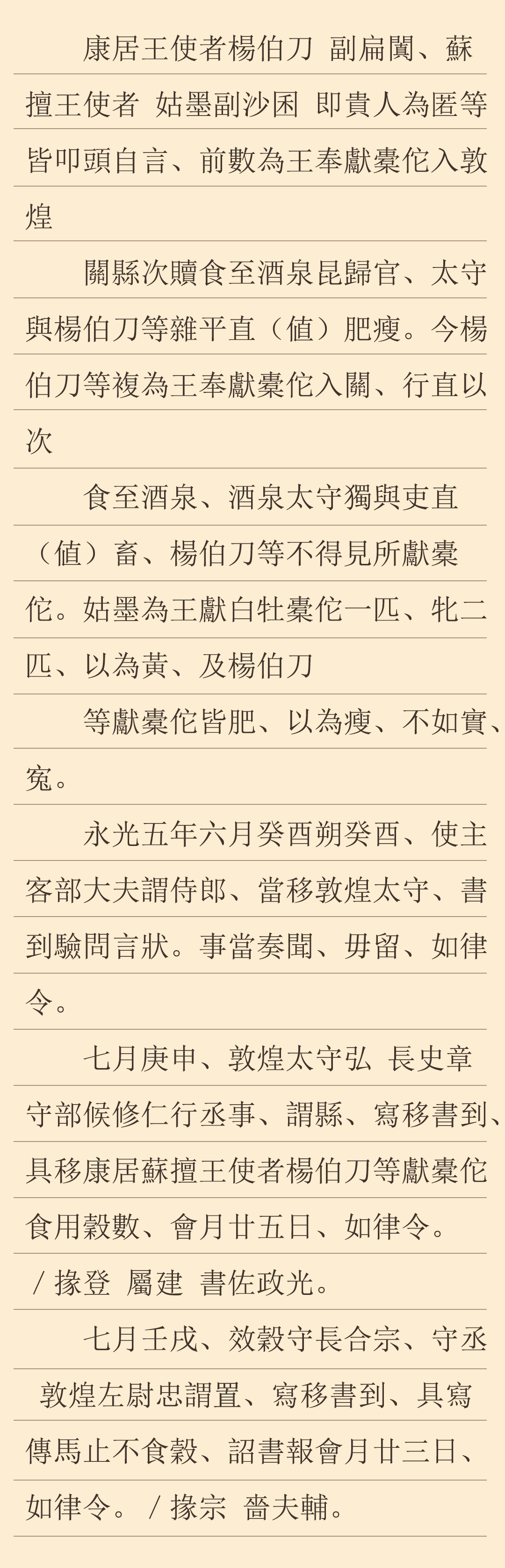 永光五年六月初一日(公元前39年7月21日),朝廷主管對外交往和蠻夷事務(wù)的使主客諫大夫行文敦煌,要求敦煌太守接到文件后對此進(jìn)行查詢并按時(shí)上報(bào)中央,不得留遲。七月庚申(9月6日),敦煌大守弘、長史章以及兼行丞事的守部候修仁聯(lián)署文件,下發(fā)效谷縣,要求縣廷接到文件后,將康居王使者路過縣境時(shí)為之提供的谷物數(shù)量,在七天之內(nèi)上報(bào)太守府。文書中有發(fā)文時(shí)掾、屬、書佐的具名。