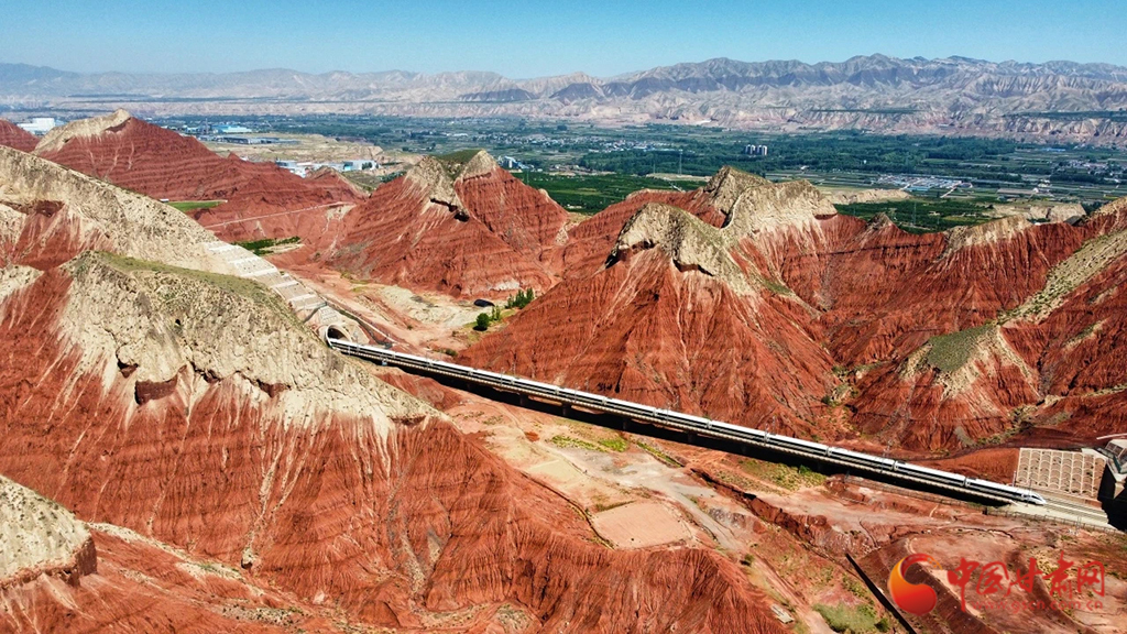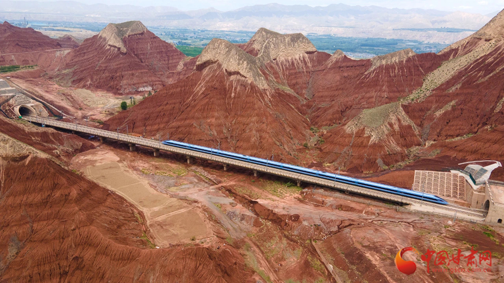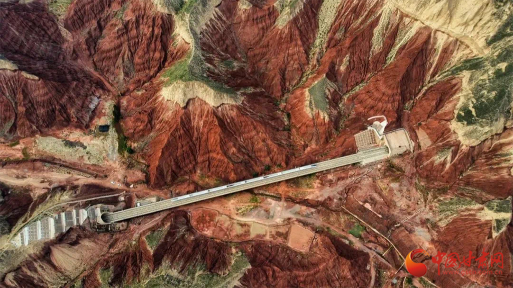 朝家山隧道位于蘭州市紅古區(qū)和青海省民和縣交界處,是蘭新高鐵西出蘭州必經(jīng)之地。在這里,通體呈紅色的丹霞地貌在湛藍天空下越發(fā)顯得艷麗奪目,列車穿越七彩丹霞,風景如畫風光無限好。
