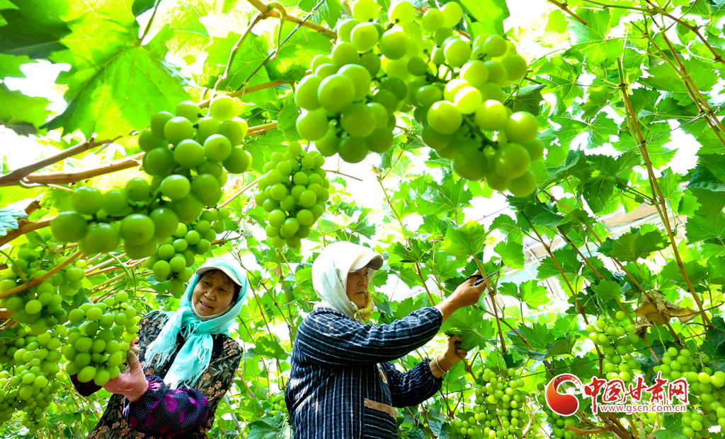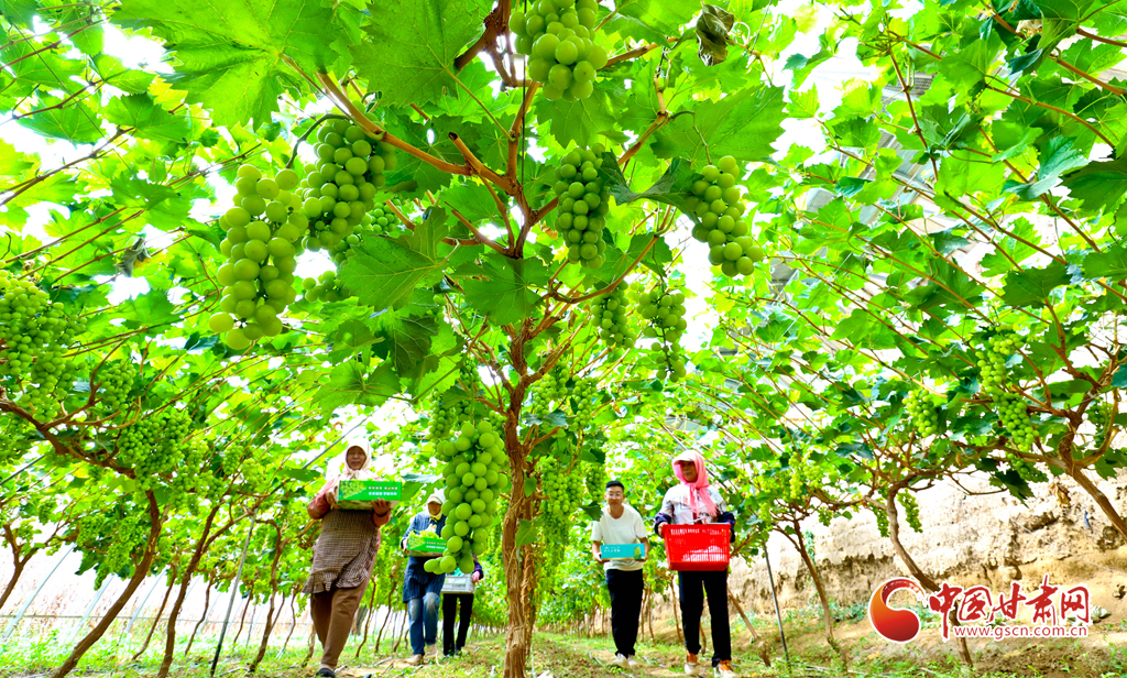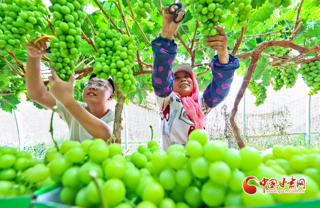 8月28日,在高臺縣南華鎮(zhèn)智號村1000畝陽光玫瑰葡萄綠色標準化產業(yè)園內,40多萬斤陽光玫瑰進入成熟采摘期,果農們正在采摘、分揀、裝箱,準備發(fā)往浙江、江蘇、新疆、青海、內蒙古等地客商的手中。
