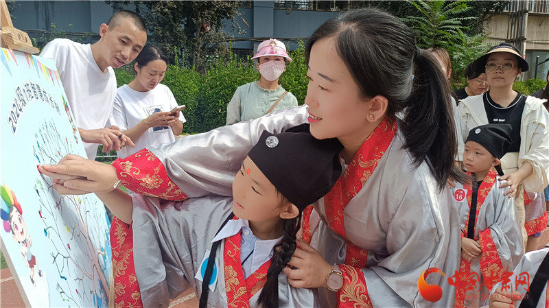 據(jù)介紹,七里河小學開筆禮服裝均由學校提供,每年使用后清洗保存,學生不用租借禮服。學校將開筆禮的儀式一年年傳承下來,希望同學們可以接受到傳統(tǒng)文化,從寫人字入手,感受人字帶來的人生哲理,開啟新的學習生涯。同時,開筆禮中的端正衣冠、朱砂啟智、擊鼓鳴志等都是傳承千年的入學禮儀,是孩子們了解中華傳統(tǒng)文化的一個窗口。