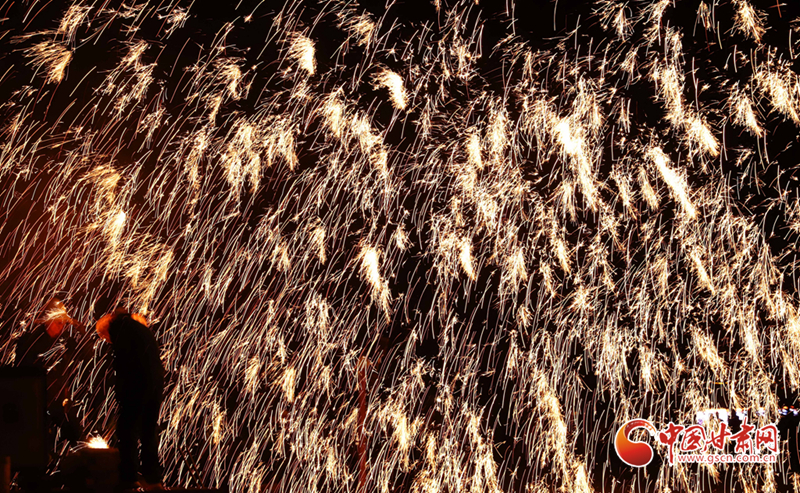 10月5日晚,位于甘肅省張掖市甘州區(qū)的玉水苑生態(tài)景區(qū)內(nèi),非遺傳承人在為游客和市民表演國家級非遺項目打鐵花。(王將 攝)