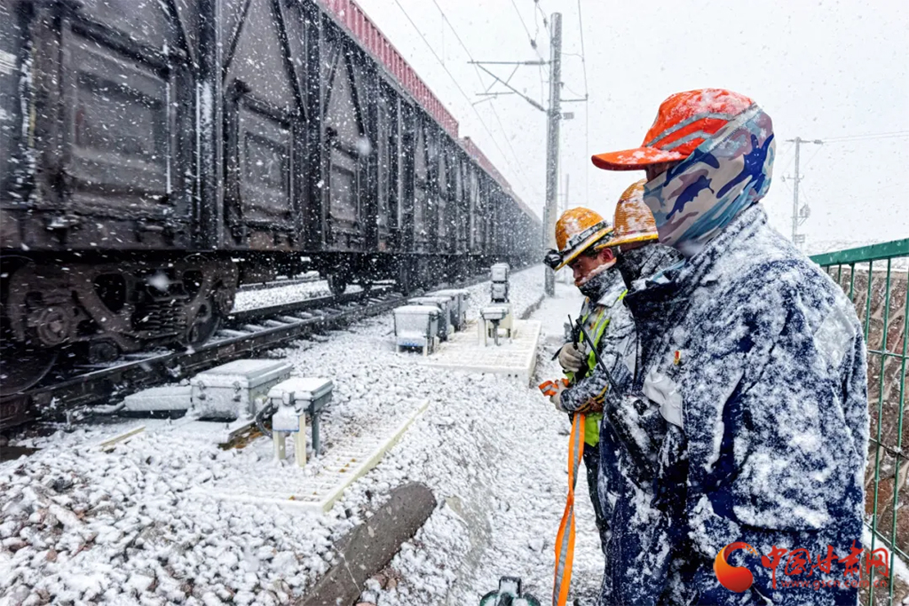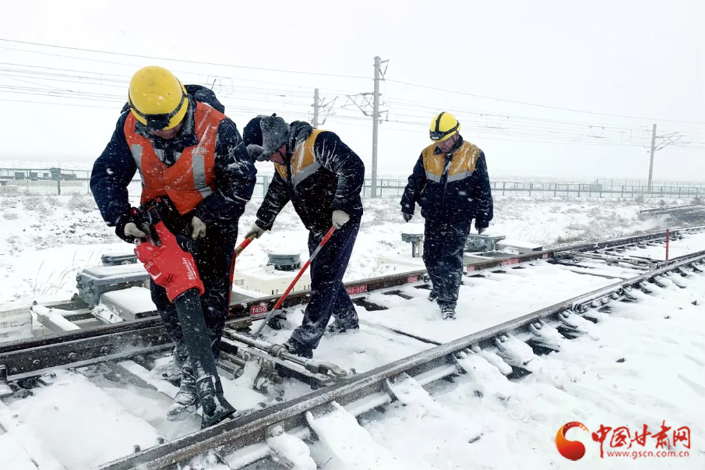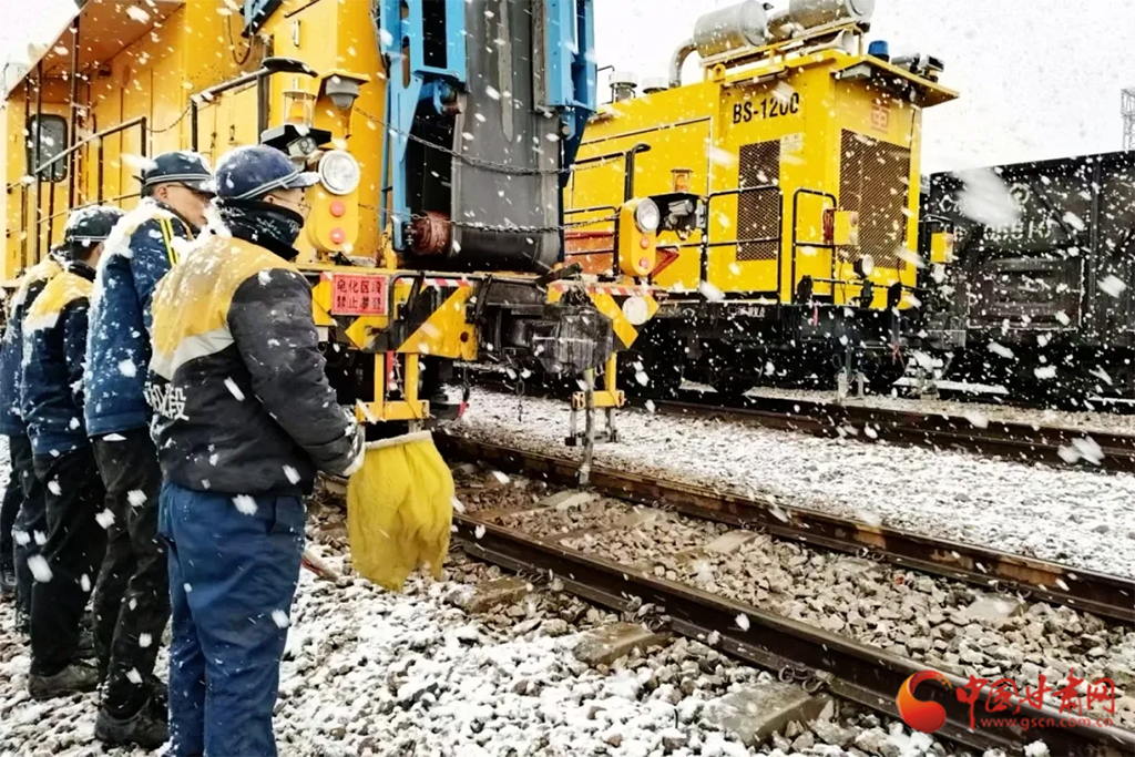 近日,受冷空氣影響,甘肅省古浪、山丹、永昌等地迎來降雪天氣。蘭州鐵路局各單位迅速啟動(dòng)應(yīng)急預(yù)案,上下聯(lián)動(dòng)、多措并舉迎戰(zhàn)風(fēng)雪,保障降雪天氣下運(yùn)輸安全暢通。(蘭州鐵路局供圖)
