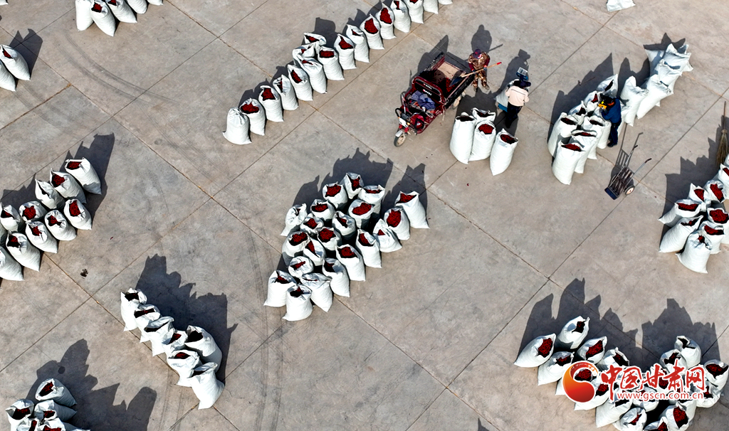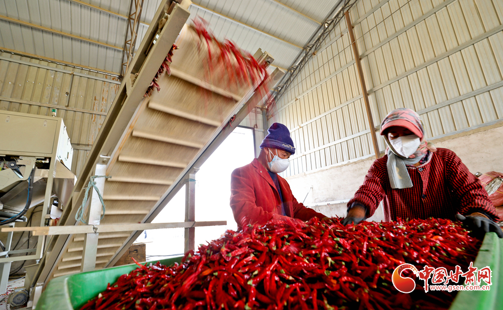 10月29日,張掖市臨澤縣新華鎮(zhèn)勝利村辣椒加工廠內,工人們正在為河南、山東的客商加工500噸紅辣椒干。